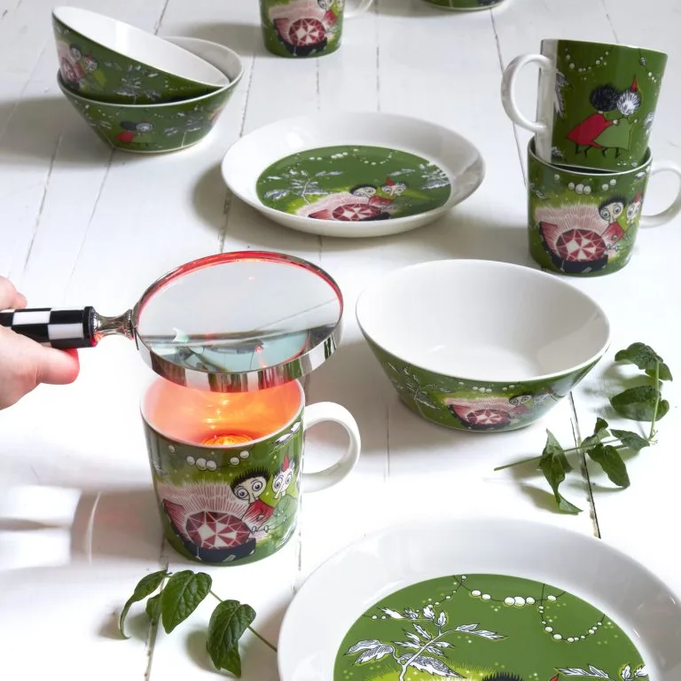 Tämän Arabian muumimukin aiheena ovat Tiuhti ja Viuhti, jotka ihailevat suurta, punaista rubiinia. He piilottelevat rubiinia matkalaukussaan ja pakenevat Muumilaaksoon turvaan rubiinia etsivää Taikuria.
