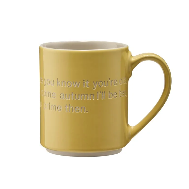 ”Kyllä, aika kuluu ja alan tulla jo vanhaksi, syksyllä täytän jo 10 ja silloin sitä onkin nähnyt elämänsä parhaimmat päivät” hymykuopat syvenevät kieltämättä tätä sitaattia lukiessa . Keltainen Astrid Lindgren-muki on ruotsalaiselta tuotemerkiltä Design House Stockholm. Saamme tutustua yhteen Astrid Lindgrenin suosituimpiin hahmoihin – fantastiseen Peppi Pitkätossuun. Muki on valmistettu kivitavarasta ja on osa Design House Stockholmin kokoelmaa joka on valmistettu yhteistyössä Astrid Lindgren AB:n kanssa.